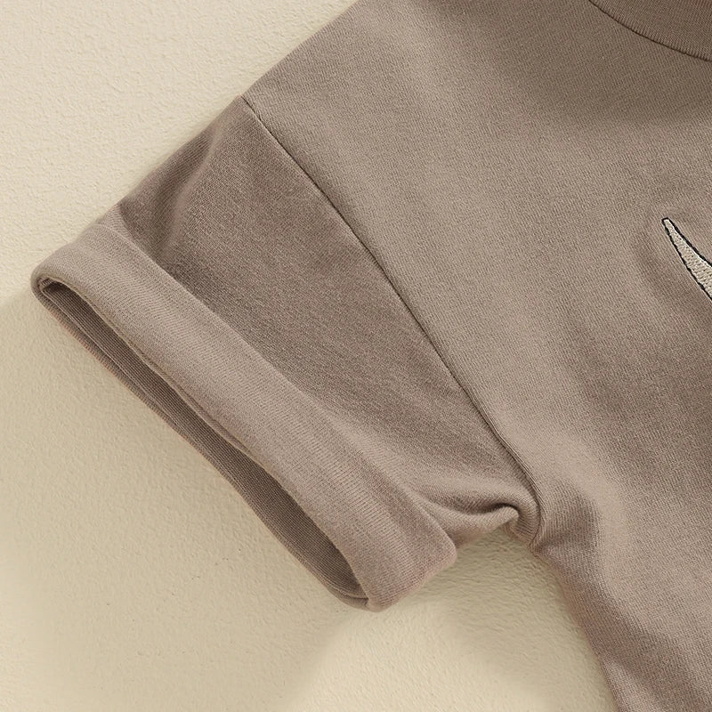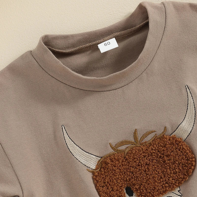 Introducing our charming Plush Letter and Cow Embroidery Short Sleeve Romper Set!